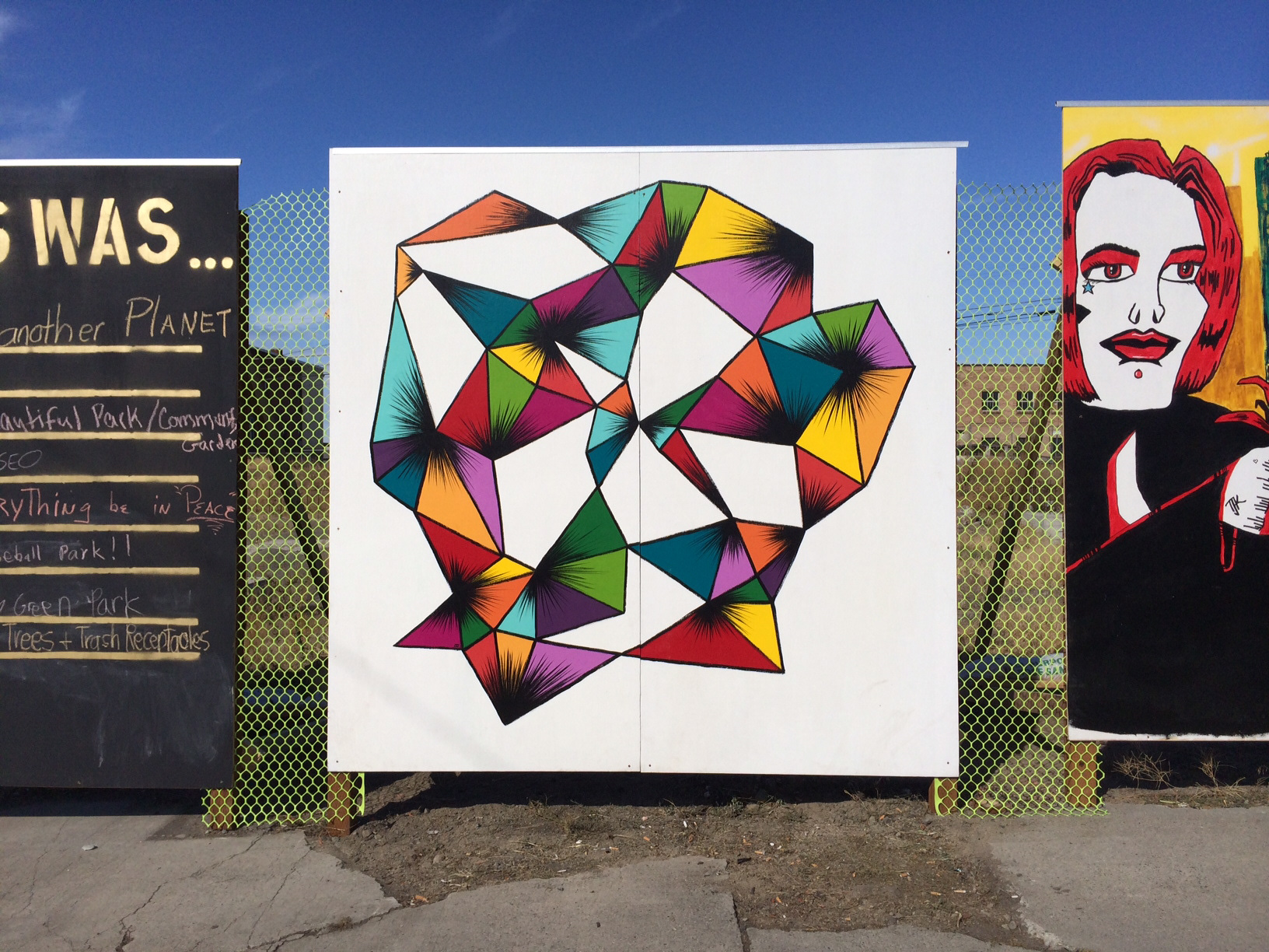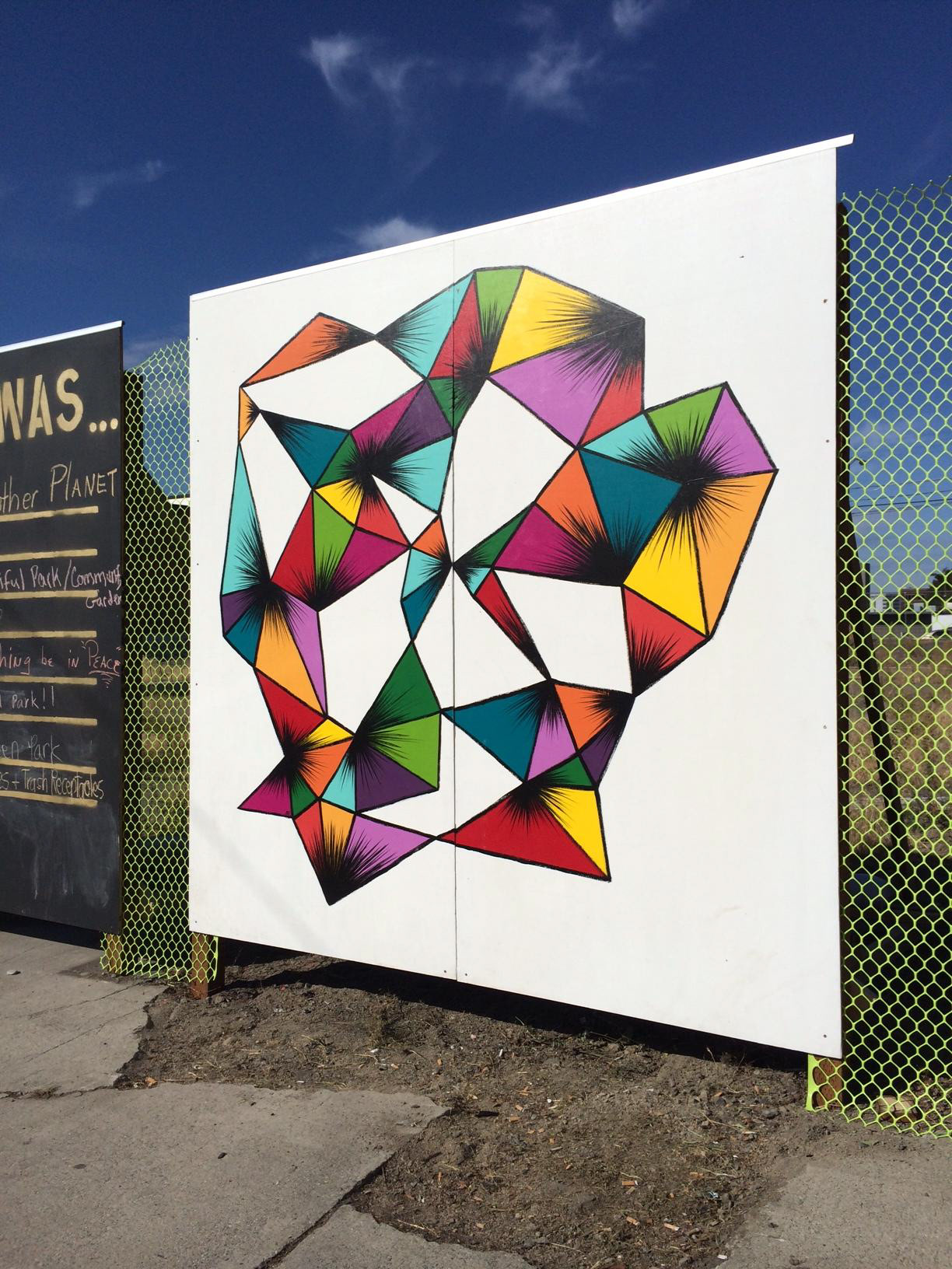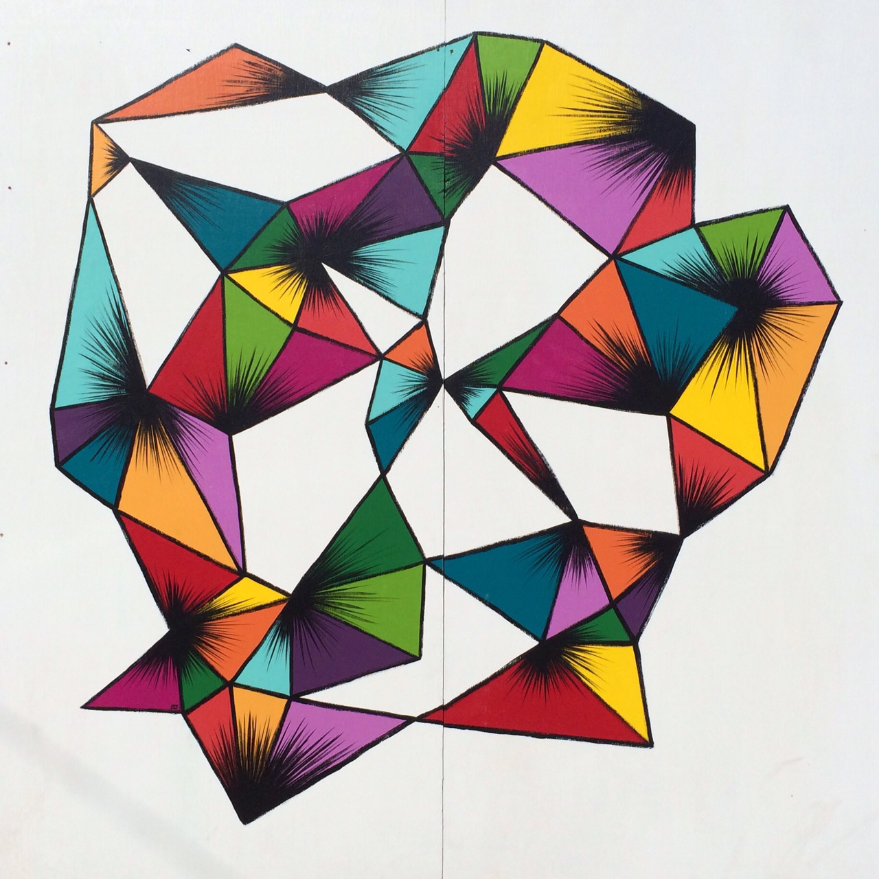 (MOBILE MURAL) ACRYLIC PAINT ON PLYWOOD, 2014 an abstract visualization of Bloomsday in Spokane, WA. the work originated from an audio file taken on race day. using the visual output, the audio was transformed to follow the path of the race map along with the elevation. The lines from the map, audio, and elevation were used to create a grid-like structure that inturn became the foundation of the final triangular image seen below.